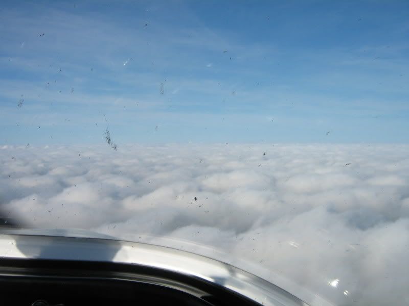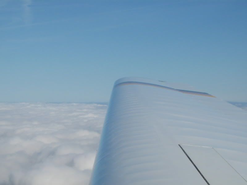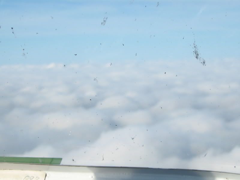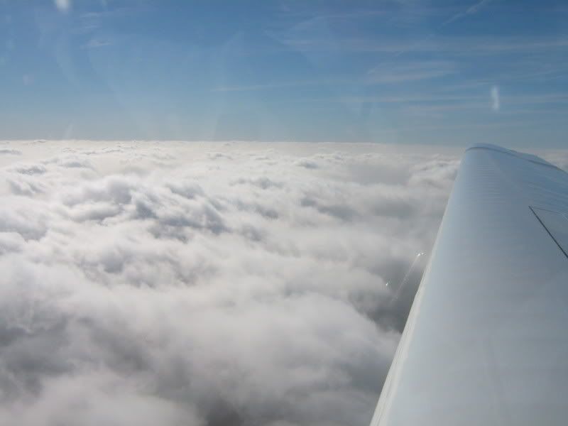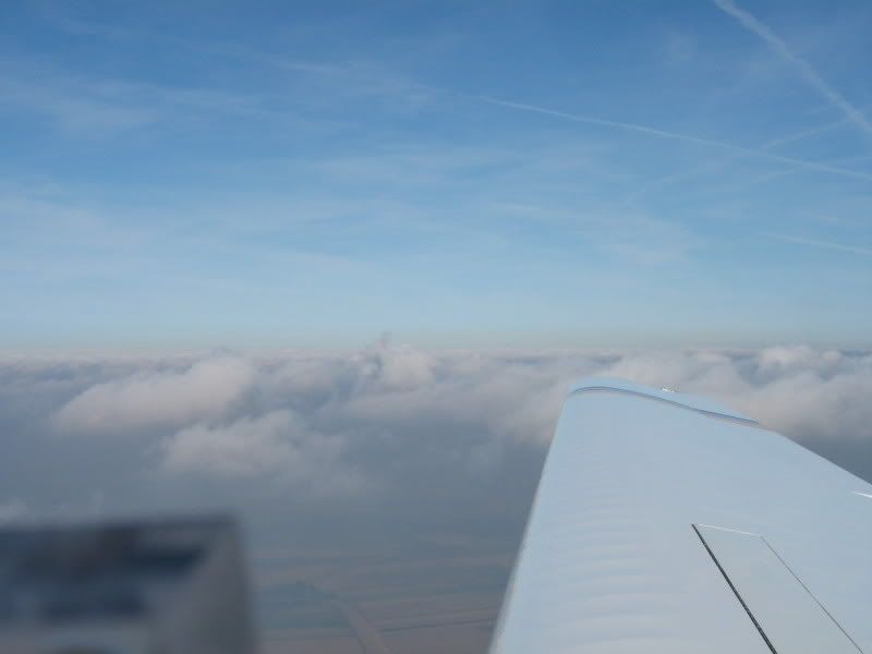 Über der Inverssion sah es aus, als wäre der Himmel vollkommen von Stratus bedeckt und vereinzeln durchstießen die Tops von Cumulanten die Stratusdecke. Tatsächlich war dies aber immernoch der, vom Boden aus nicht zu sehende Nebel. In die Kontrollzone wären wir wenn überhaupt nur mit Sonder-VFR reingekommen, also Plan B, ab nach Rendsburg Schachtholm (ca 75km nördlich) Wurst essen und zurück.